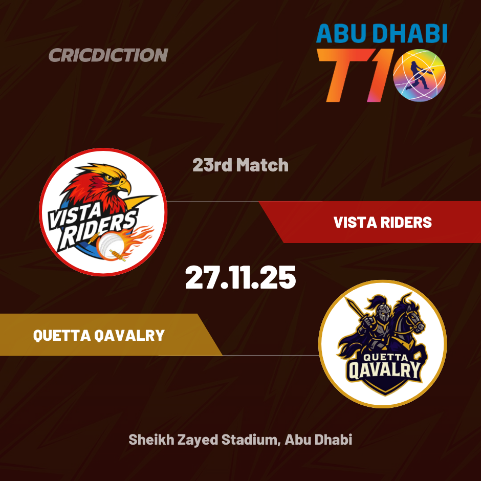 Match Preview – Vista Riders vs Quetta Qavalry( VIR vs QUQ ), Dream11 Prediction, Abu Dhabi T10, 23rd Match. Who Will Win, On November 27, 2025