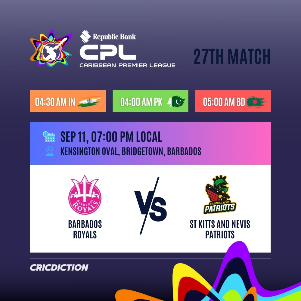 Make sure to catch all the action live as the Barbados Royals take on the St Kitts And Nevis Patriots in what is shaping up to be a blockbuster showdown in the Caribbean Premier League 2025. Stay tuned for an evening of entertainment, sportsmanship, and cricketing excellence.