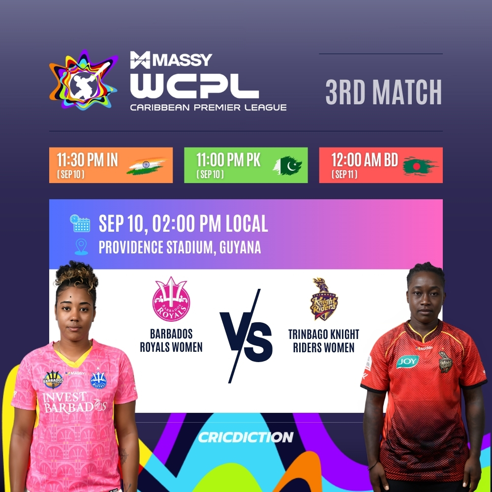 - Match: Barbados Royals Women vs Trinbago Knight Riders Women( BR-W vs TKR-W ), 3rd Match, Women’s Caribbean Premier League 2025