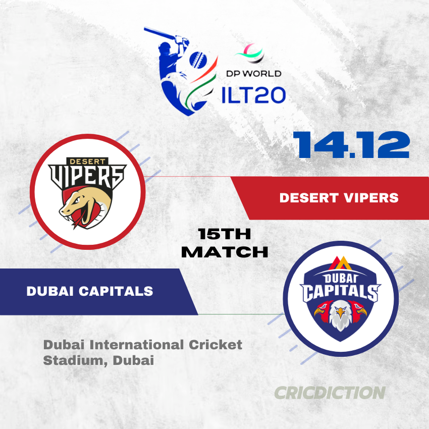 The Desert Vipers are gearing up to face off against the Dubai Capitals in the 15th match of the International League T20 for the 2025-26 season. This highly anticipated match is set to take place on December 14 at the Dubai International Cricket Stadium in Dubai. The game is scheduled to kick off at 02:30 pm GMT, 08:00 pm IST, and 06:30 pm local time.