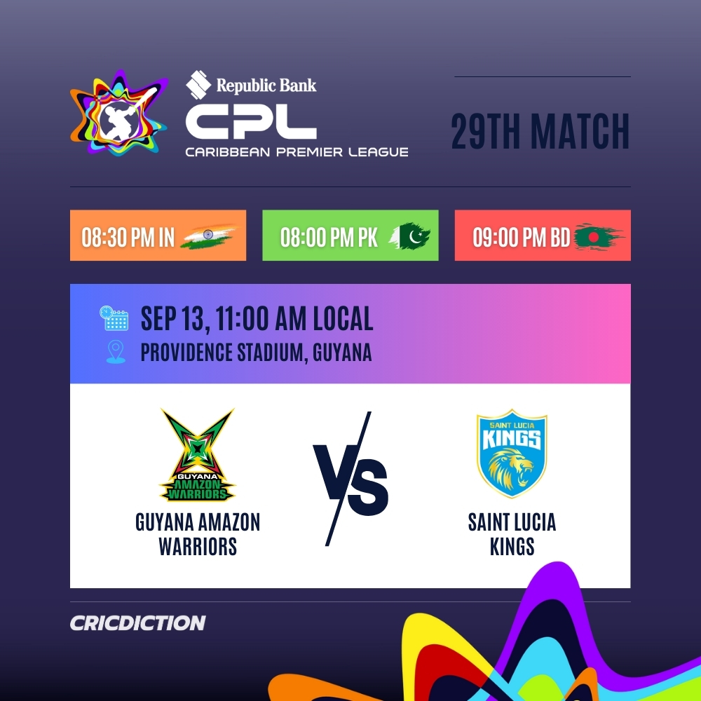 The Caribbean Premier League 2025 is heating up as Guyana Amazon Warriors (GAW) prepare to take on Saint Lucia Kings (SLK) in their 29th match at Providence Stadium on September 13. The match is scheduled to start at 03:00 pm GMT, 08:30 pm IST, and 11:00 am local time.