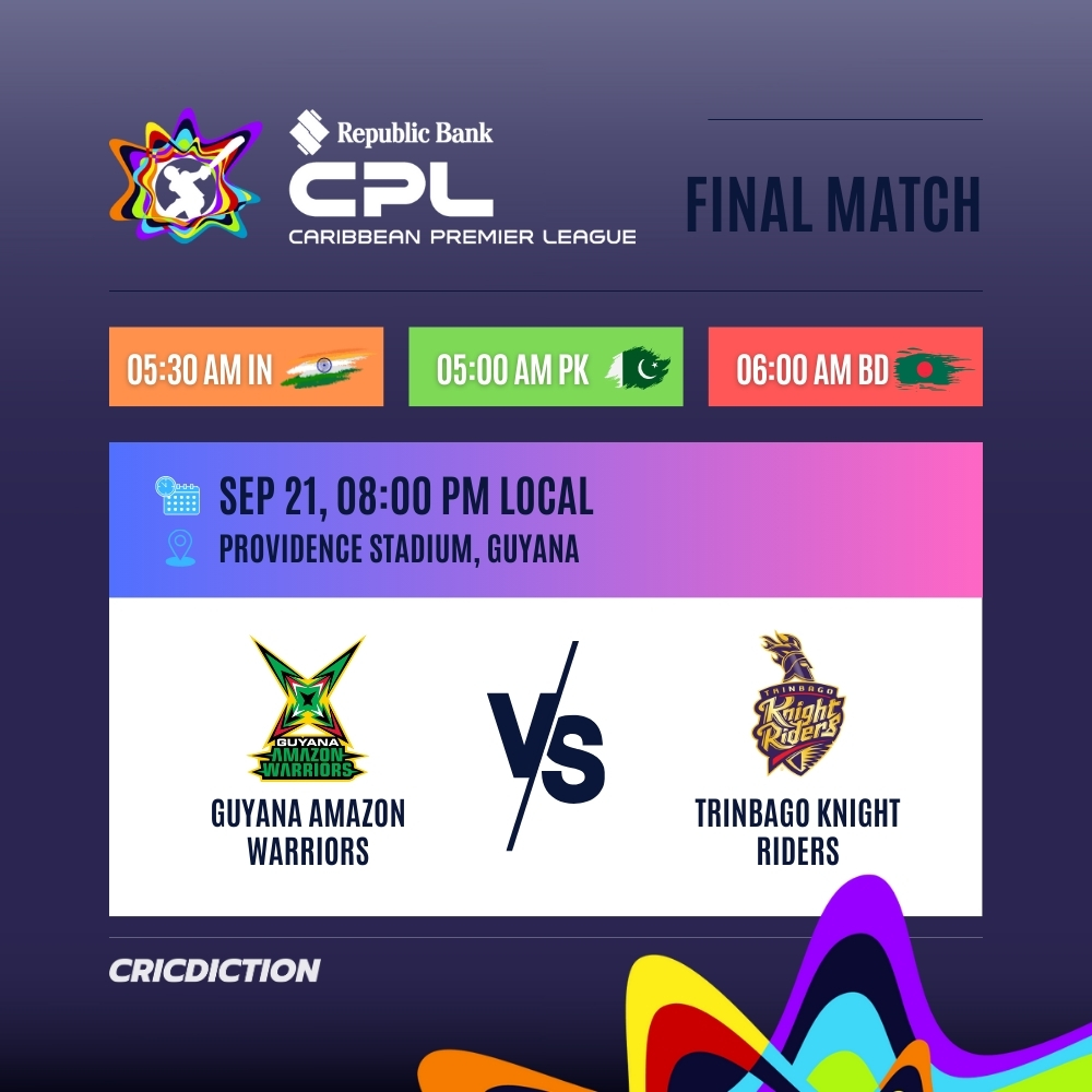 The final between Guyana Amazon Warriors and Trinbago Knight Riders promises to be an exciting showdown, with both teams aiming for glory in the Caribbean Premier League 2025. Stay tuned for a thrilling encounter!