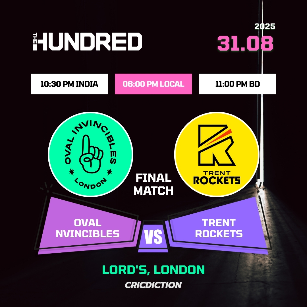 The much-anticipated final match of The Hundred Men’s Competition 2025 is set to take place between Oval Invincibles (OI) and Trent Rockets (TR) at Lord’s in London on August 31. Both teams have shown exceptional form throughout the tournament, making this final clash even more thrilling.