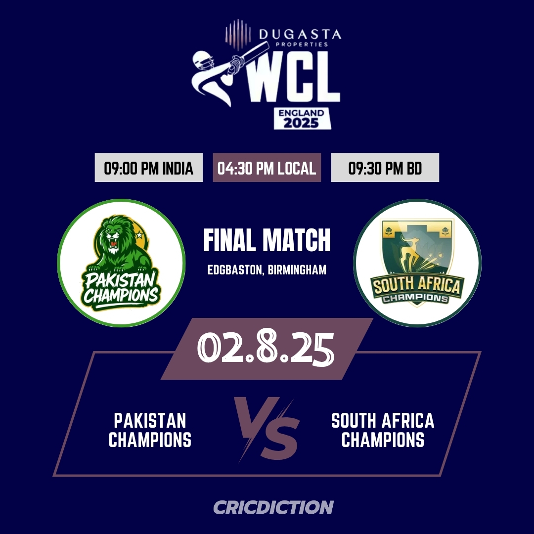 The highly anticipated final match of the World Championship of Legends 2025 will see Pakistan Champions (PAKC) take on South Africa Champions (SAC) at Edgbaston, Birmingham on August 2. The match is scheduled to kick off at 03:30 pm GMT / 05:00 pm IST / 04:30 pm local time.