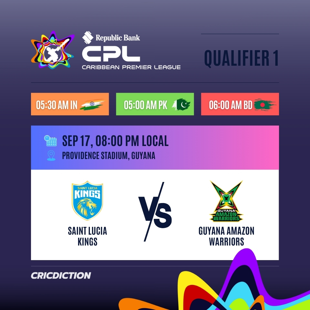 On September 17, the Saint Lucia Kings will go head-to-head against the Guyana Amazon Warriors in the Qualifier 1 match of the Caribbean Premier League 2025. The highly anticipated clash is set to take place at the Providence Stadium in Guyana.
