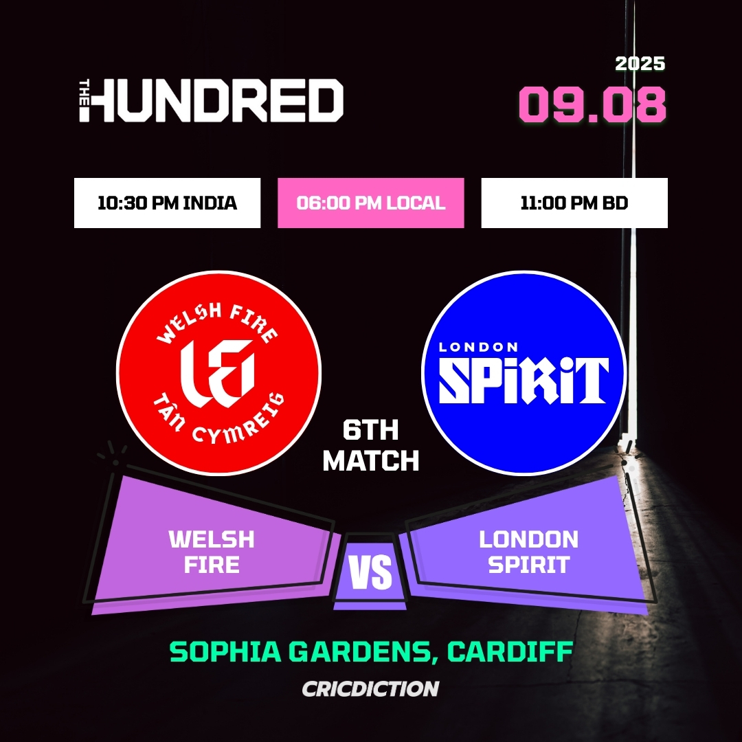 On August 9, the Welsh Fire (WF) will clash against the London Spirit (LS) in the 6th match of The Hundred Men’s Competition 2025 at Sophia Gardens in Cardiff. The match is set to kick off at 5:00 pm GMT, 10:30 pm IST, and 6:00 pm local time.